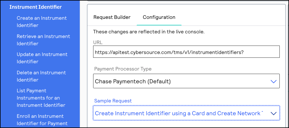 - In the Sample Request drop-down menu, chooseCreate Instrument Identifier using a Card and Create Network Token: